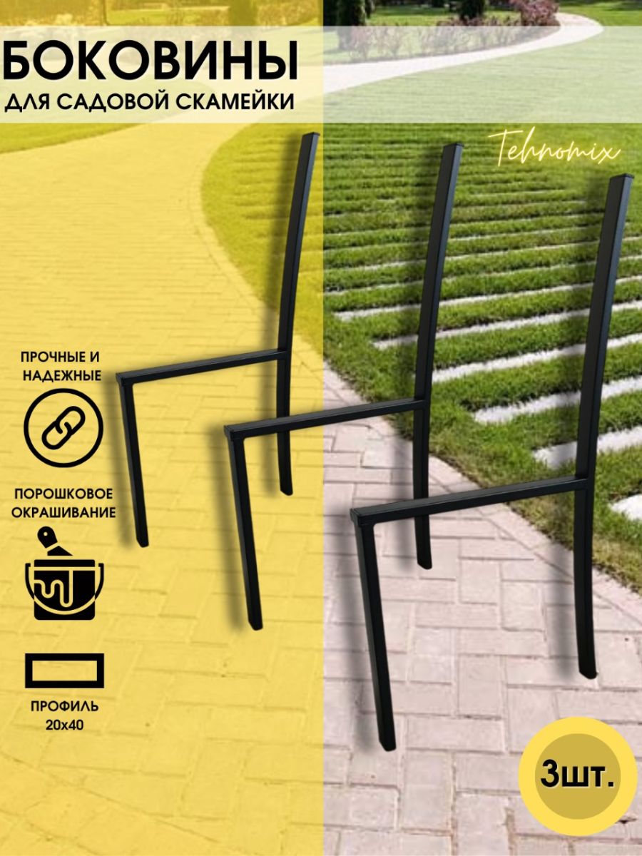 Боковины для скамейки для дачи и огорода со спинкой в классическом стиле. Прочный сварной металлический каркас из профильной трубы 40*20 мм. Покрыт полимерно-порошковой краской. Ножки и отверстия в каркасе закрыты пластиковыми заглушками.