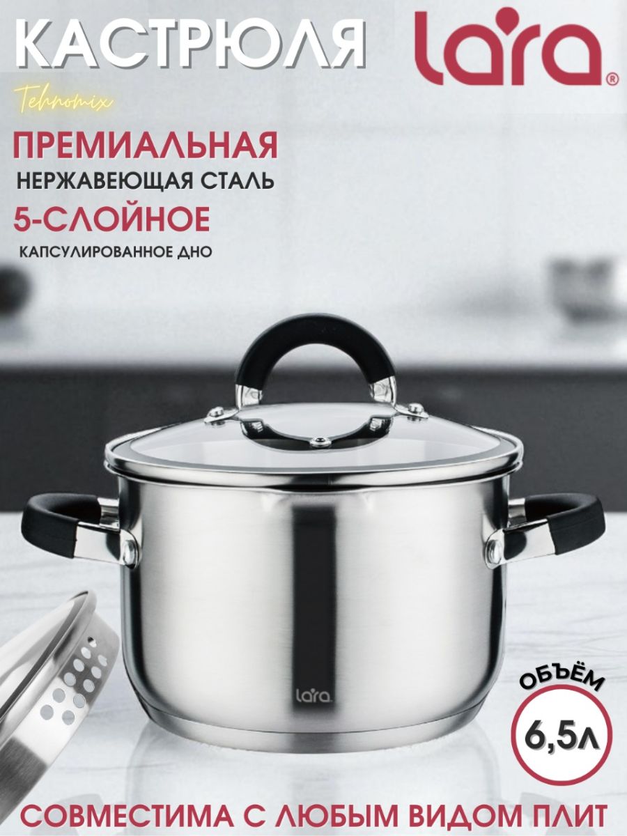 Кастрюля LARA 02-9003 6,5л., со сливом, подходит для ИНДУКЦИИ