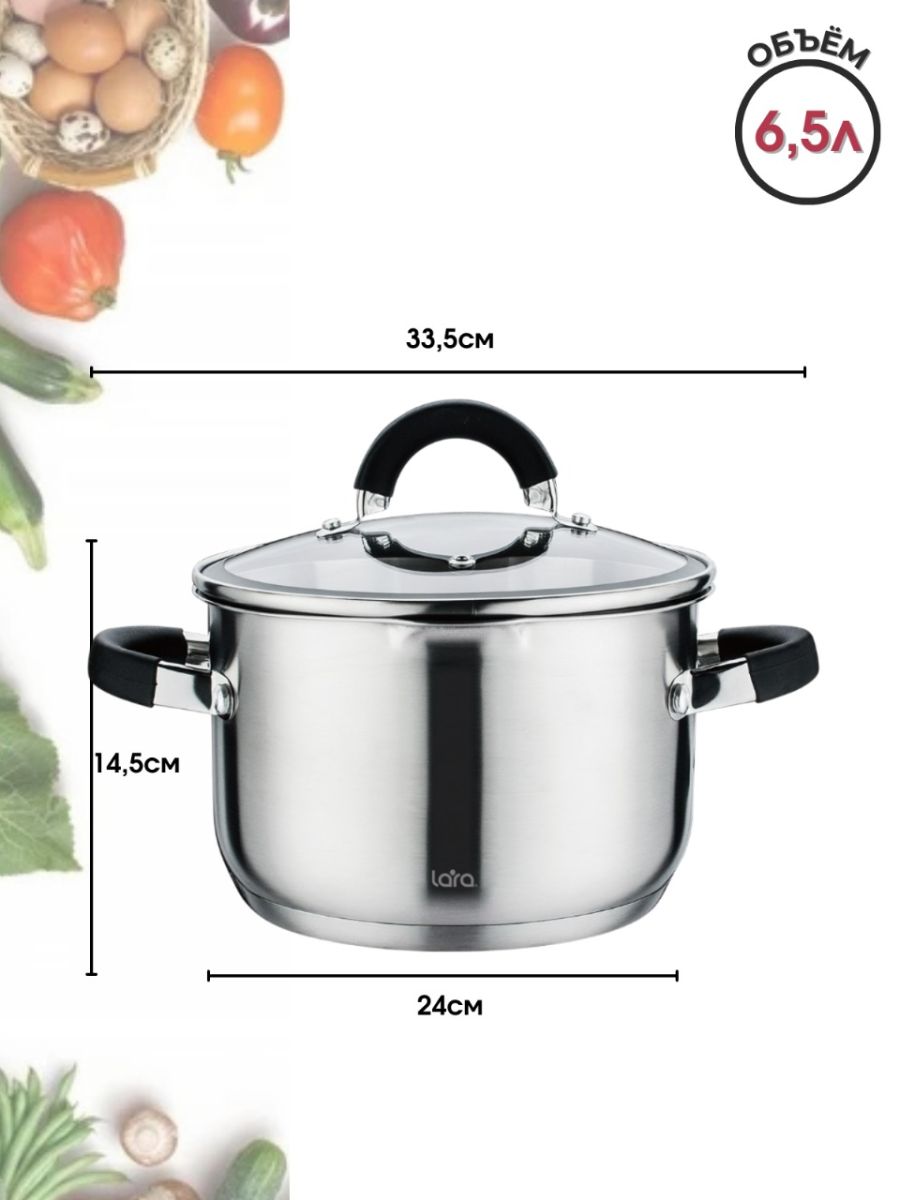 Кастрюля LARA АФИНА 02-270 ЛИК 6,5л, капсулированное индукционное дно, стеклянная крышка