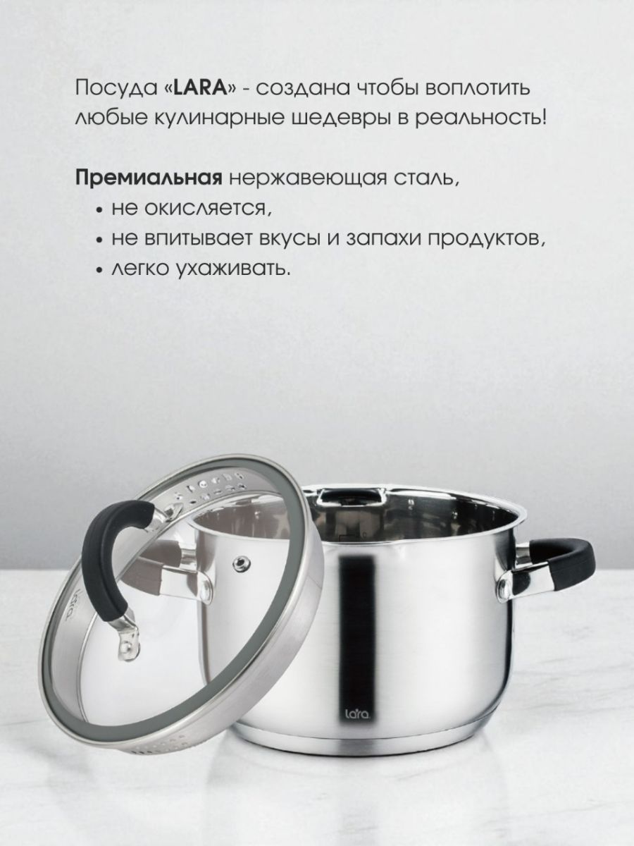 Кастрюля LARA АФИНА 02-268 3,9л, капсулированное индукционное дно, стеклянная крышка