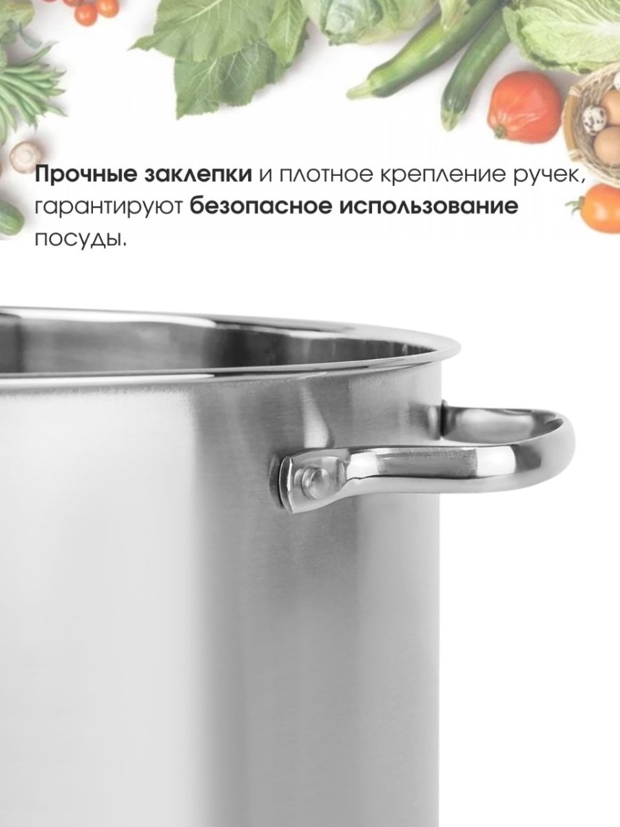 Кастрюли серии «АТЛАНТ» – посуда увеличенного объема, которая подойдет не только для дома, но и для профессиональных кухонь ресторанов, кафе и столовых. Премиальная нержавеющая сталь, не окисляется, не впитывает вкусы и запахи продуктов, легко ухаживать а так же можно мыть в посудомоечной машине. Прочные заклепки и плотное крепление ручек, гарантируют безопасное использование посуды. Крышка выполнена из устойчивого к высоким температурам стекла и металла, оснащена встроенным паровыпуском. Толстое 5-ступенчатое капсулированное дно равномерно распределяет нагрев по всей посуде – идеально подходит для варки, тушения, кипячения супов и других способов тепловой обработки продуктов.