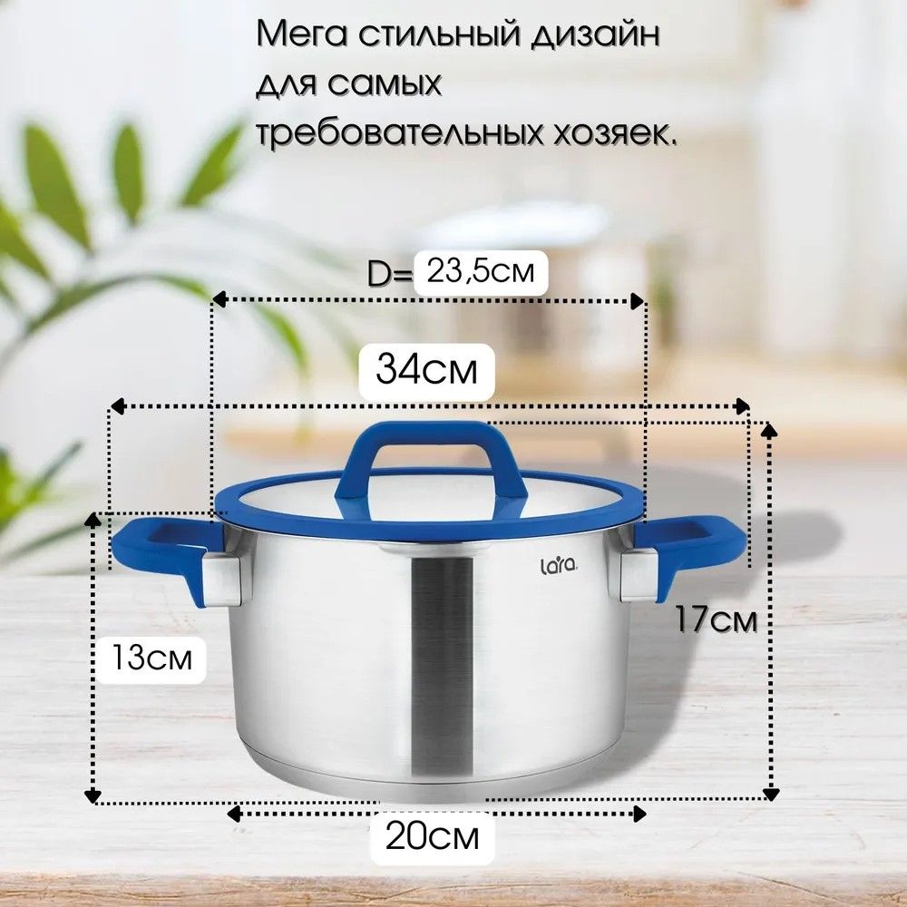 Кастрюли LARA серии «Сапфир» в современном дизайне придутся по душе любой хозяйке. На крышке есть силиконовый ободок синего цвета для повышенной фиксации ручки – это придает изделию оригинальный внешний вид и делает его стильным элементом посуды на кухне.