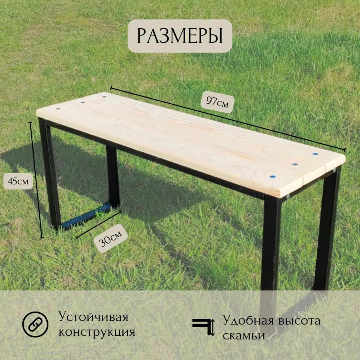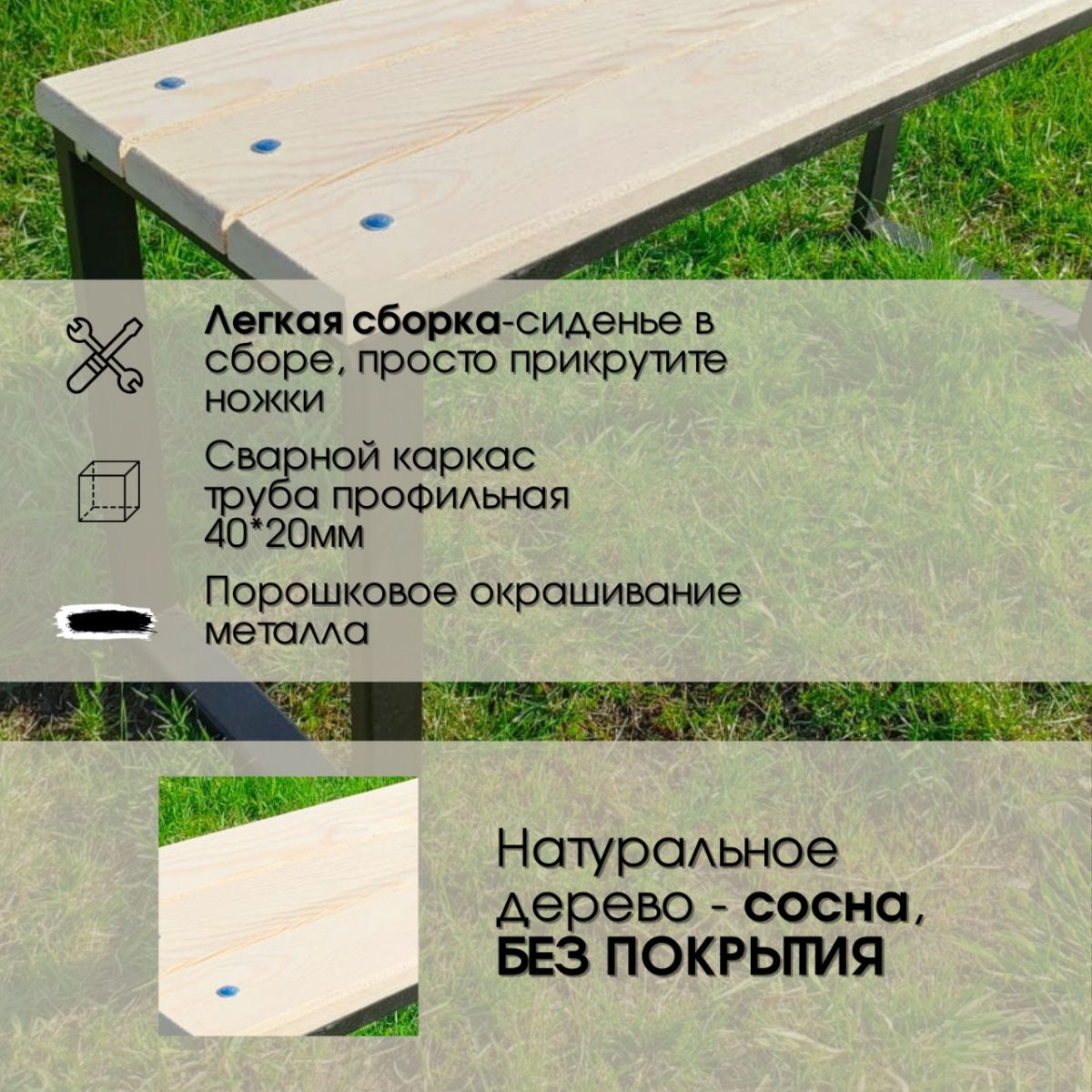 Дерево-сосна отшлифовано, без покрытия. Лавочка металлическая доставляется в разобранном виде, легкая сборка- сиденье в сборе, прикрутить только ножки. Скамейка уличная прекрасно переносит влажные погодные условия, можно использовать в саду и на даче. Лавка в баню или сауну прекрасно сочетается с натуральным деревом.