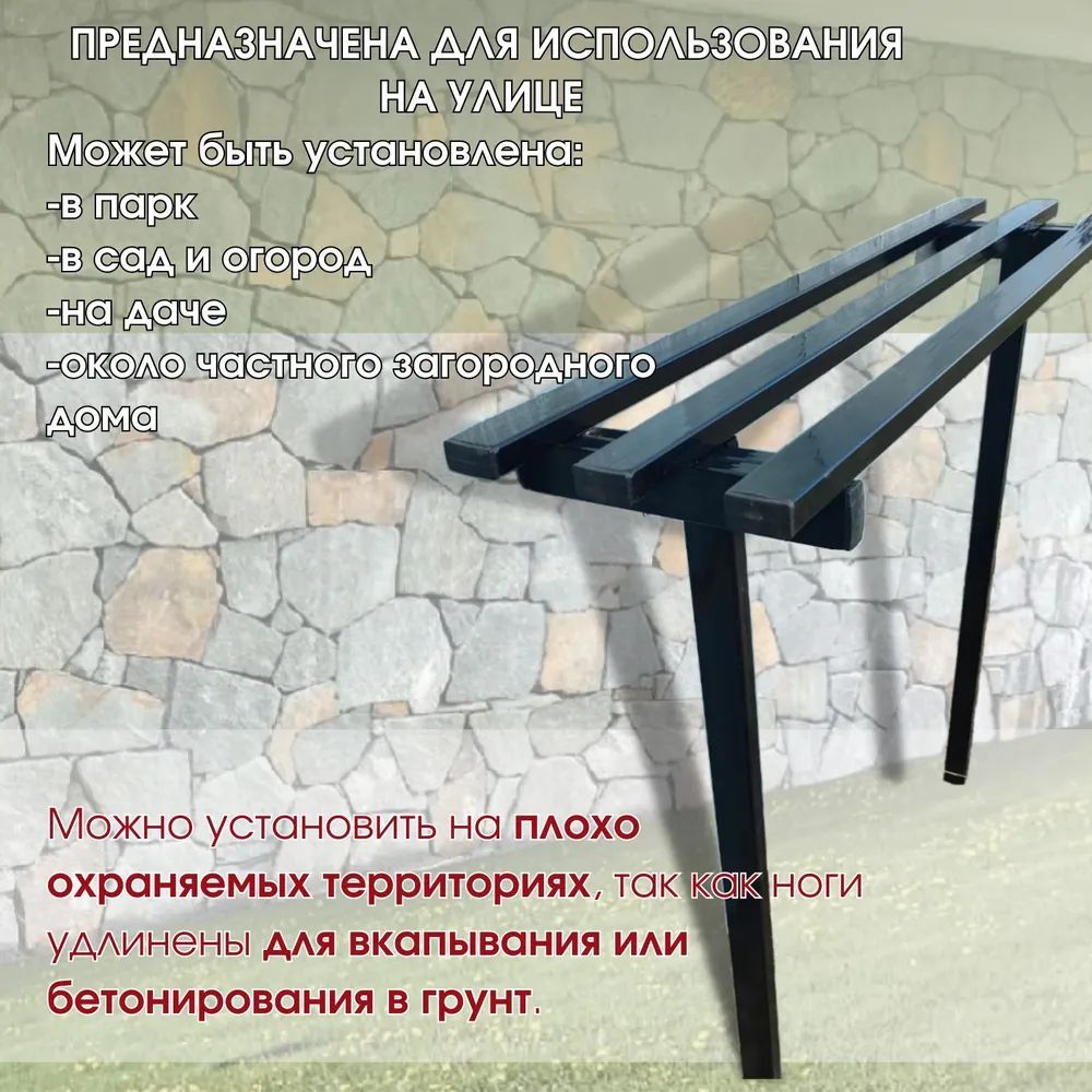 Лавочка металлическая садовая, парковая предназначена для использования на улице. Лавка может быть установлена в парк, в сад и огород, около частного загородного дома. Лавка оснащена штырями для бетонирования или вкапывания в грунт ( удлиненные ножки) поэтому она отлично подойдет для установки на неохраняемых или плохо охраняемых территориях.
