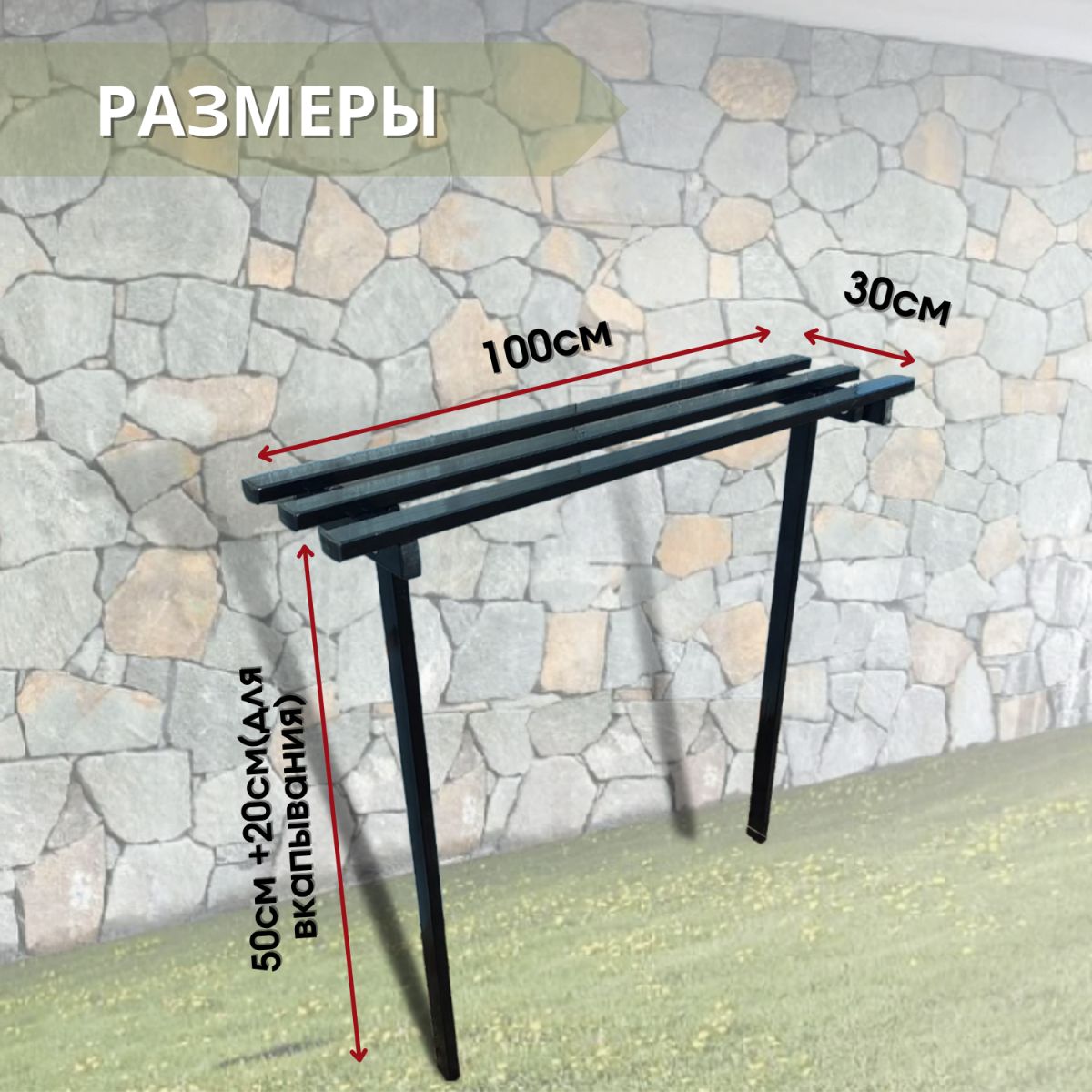 Длина лавки 100 см, ширина 30 см, высота 50 см + 20 см ( для вкапывания или бетонирования).