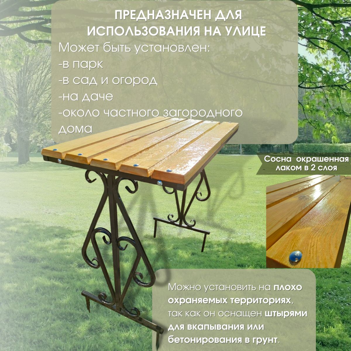 Стол садовый металлический, предназначен для использования на улице. Садовый стол может быть установлен в парк, в сад и огород, около частного загородного дома. Стол уличный можно установить на плохо охраняемых территориях, таких как кладбище. Стол дачный уличный оснащен штырями для вкапывания или бетонирования в грунт. Каркас стола с элементами ковки изготовлен из профильной трубы и покрыт глянцевой порошковой краской черного цвета. Столешница выполнена из хвойного дерева (сосна), отшлифована, без обработки. Конструкция стола разборная. Состоит из 4 элементов: столешница в сборе, 2 боковины и крепления. Поставляется в картонной коробке, благодаря этому стол придет к вам в целости и сохранности. Длина стола 100 см, ширина 40, высота 80 см + 20 см штыри. Вес 9,7 кг. Так же можно приобрести скамейки из этой коллекции и у Вас получится отличный и практичный комплект.